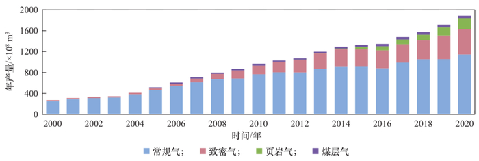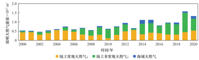 图 1 我国天然气新增探明储量构成图(2000—2020年)
