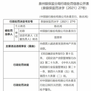 中国银行永春支行被罚 超进度发放房地产开发贷款