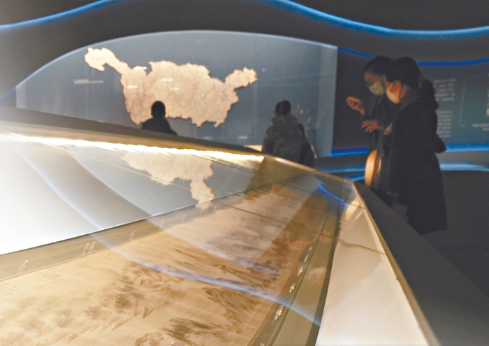 “倒泻银河鼓浪东,百舸万里画廊中。”展厅里,不少古画卷自配“图说”,观众可以一览长江沿途的风景名胜、历史典故、名人故居、地理位置等内容。