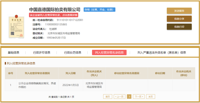 原标题:中国嘉德因“隐瞒真实情况、弄虚作假”被列经营异常名录,法人杜越新背靠中诚信集团 来源:蓝鲸财经
