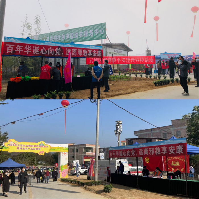 近日,2021广东省云浮市云城区第四届番薯节暨特色农产品云展会在云城区前锋镇举行,现场吸引众多商家和周边村民群众到场参展、购物、游玩。云城区反邪教协会紧抓契机,组织平安志愿者、网格员到展会入口处搭建宣传站,开展“远离邪教享安康”主题宣传活动。