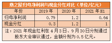 报告期内,燕之屋的现金分红达2.5亿元,其中2019年、2020年分红金额分别为0.3亿元、1.2亿元。在2021年,燕之屋的两次分红方案分别在4月3日、9月30日获得股东大会审议通过,金额分别为0.5亿元,合计1亿元。