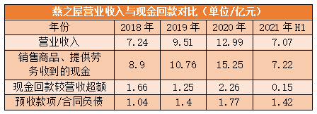 2021年上半年,燕之屋现金回款较营业收入超额缩小至0.15亿元,较2020年的2.26亿元减少了2.11亿元;同期的预收账款为1.42亿元,较2020年末减少了0.35亿元。