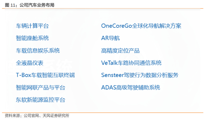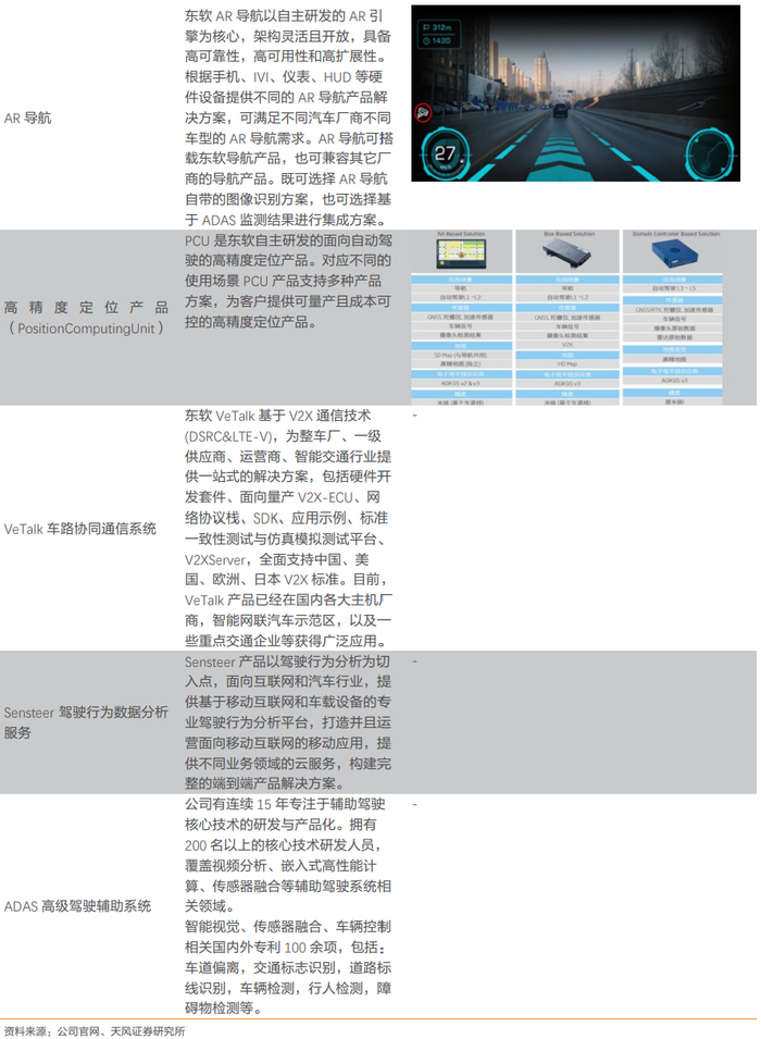公司前旗下子公司东软睿驰是目前国内商用车ADAS领域为数不多具备从硬件(摄像头、域控制器)、基础软件平台及功能应用开发的全栈解决方案提供商,已经前装量产的商用车客户包括一汽解放,东风、陕汽、福田、戴姆勒、江淮、红岩等国内数家头部商用车车企。