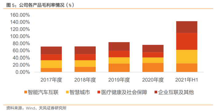 公司2020年智能汽车互联、智慧城市、医疗健康与社会保障与企业互联及其他毛利率分别为18.96%、24.86%、40.11%与26.59%。2021年H1智能汽车互联、智慧城市、医疗健康与社会保障与企业互联及其他毛利率分别为24.39%、37.83%、47.57%与32.81%。