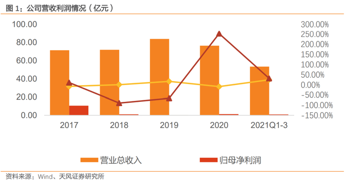 公司2017年至2021年前三季度,公司营收分别为73.31亿元,71.71亿元、83.66亿元,76.22亿元与53.21亿元。公司2020年度营收下降系疫情与新收入准则影响。