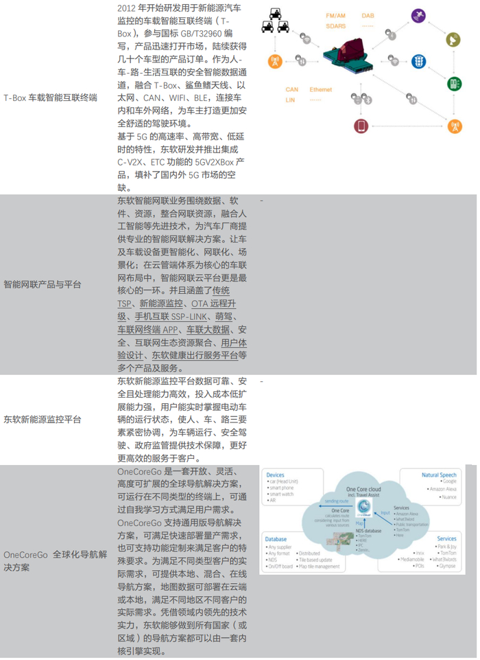 东软是全球领先的汽车电子产品和服务供应商,在汽车电子业务领域,经过近三十年的积累与发展,技术与市场份额都处于领先地位。公司始终坚持以软件技术为核心,通过软件与服务的结合,软件与制造的结合,技术与行业能力的结合,提供行业解决方案、智能互联产品、平台产品以及云与数据服务。近年来,公司执行创新与全球化发展策略,以自主知识资产为核心,驱动业务的专业化、IP化、互联网化发展,推动公司核心业务持续稳定健康增长。同时,通过软件、技术与垂直行业的深度融合,推动大医疗健康、大汽车、智慧城市等领域的变革,不断探索新业务新模式,为公司发展增加新的动能。公司重点发展医疗健康及社会保障、智能汽车互联、智慧城市、企业互联等领域,持续聚焦核心业务,在云计算、大数据、物联网、人工智能(AI)、区块链等新技术的应用持续取得进展。