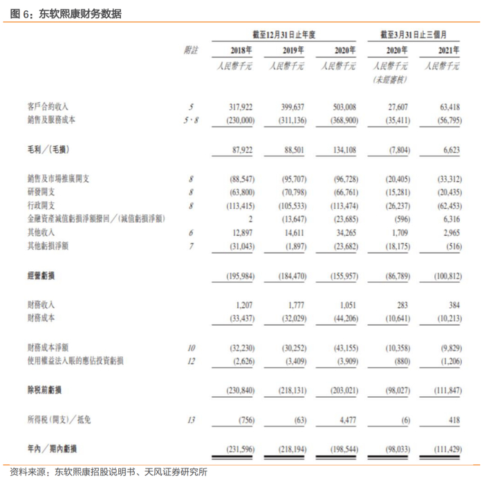 以东软熙康为例,2018年、2019年、2020年三个财政年度和2021年第一季度,东软熙康的营业收入分别为3.18亿、4.00亿、5.03亿和0.63亿元人民币,相应的净亏损分别为2.32亿、2.18亿、1.99亿和1.11亿元人民币。