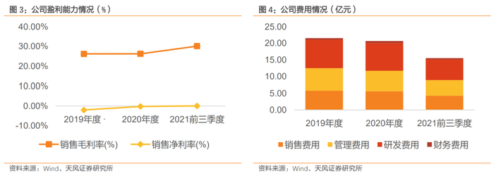 2019年-2021年前三季度,公司销售毛利率为26.19%、26.21%与30.10%。2019年-2021年前三季度,公司期间费用分别为21.60亿元、20.65亿元与15.50亿元。