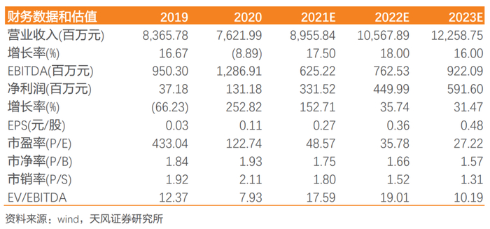 投资建议:预计公司2021/22/23年实现营业收入89.56、105.68亿元、122.59亿元,归母净利润2021-2023年预计为3.31、4.50、5.92亿元,首次覆盖,采取PE-PS平均值预测得目标股价为24.35元,给予买入评级。