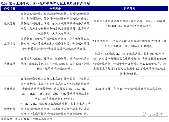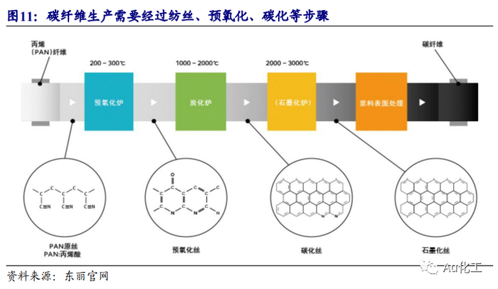 碳纤维性能优异,大丝束碳纤维发展前景广阔。碳纤维是由聚丙烯腈(PAN)(或沥青、粘胶)等有机纤维在高温环境下裂解碳化形成的含碳量高于90%的碳主链结构无机纤维,其制备工艺包括聚合、纺丝、预氧化、碳化、表面处理、碳纤维形成、成品加工等步骤。碳纤维具有质轻、高强度、高模量、导电、导热、耐腐蚀、耐疲劳、耐高温、膨胀系数小等一系列优良性能,在航空航天、风电叶片、体育休闲、压力容器、碳/碳复合材料、交通建设等领域广泛应用。按照每束碳纤维中单丝根数,碳纤维可以分为小丝束和大丝束两大类别,1K即1个丝束含1000根碳纤维,一般将48K(每束含有48000根碳纤维)及以上称为大丝束碳纤维,也称为工业级碳纤维,主要有50K、60K、120K、240K、360K等;反之则称为小丝束碳纤维,也称为宇航级碳纤维,主要有1K、3K、12K、24K等。小丝束碳纤维性能优异但价格较高,一般用于航天军工等高科技领域,以及体育用品中产品附加值较高的产品类别;大丝束产品性能相对较低但制备成本亦较低,因此往往运用于基础工业领域,包括土木建筑、交通运输和风电能源等。相较之下,大丝束碳纤维的优势在于相同的生产条件下,可大幅提高碳纤维单线产能和质量性能,并实现生产低成本化,从而打破碳纤维高价带来的应用局限,因此具备广阔的发展前景。