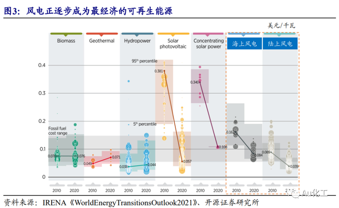 风电成本大幅下降,推动全球发电结构转型。近年来可再生能源(风能、太阳能、生物能源和地热能,不包括水电)在全球发电增量中占比约60%;2020年全球可再生能源新增发电量创新高(358太瓦时),风能、太阳能发电量快速增加,其中风电增速强劲,达173太瓦时。风力发电分为陆上风电和海上风电,据国际可再生能源机构,2010-2020年,全球陆上风电成本从0.089美元/千瓦时降至0.039美元/千瓦时,下降56%;全球海上风电成本从0.162美元/千瓦时降至0.084美元/千瓦时,下降48%,风电正逐步成为全球范围内最经济的可再生能源。