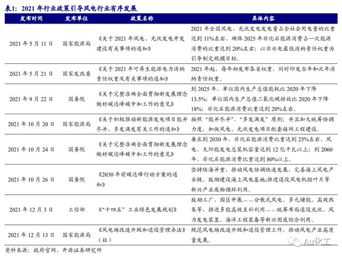 近两年国内“抢装潮”带动风电新增并网量大幅增长。近年来,国家积极出台电价和税收优惠配套政策推动风电产业发展,《关于2021年新能源上网电价政策有关事项的通知》明确2021年起陆上风电实行平价上网,大批项目加速推进。《关于促进非水可再生能源发电健康发展的若干意见》提出新增海上风电不再纳入补贴范围,按规定完成核准(备案)并于2021年12月31日前全部机组完成并网的存量海上风力发电,按相应价格政策纳入中央财政补贴范围。政策驱动风电行业新增装机量高增,2021年1-11月国内新增风电并网装机容量24.70GW;截至2021年11月,全国风电累计并网装机容量约3.05亿千瓦,同比增长29.1%。
