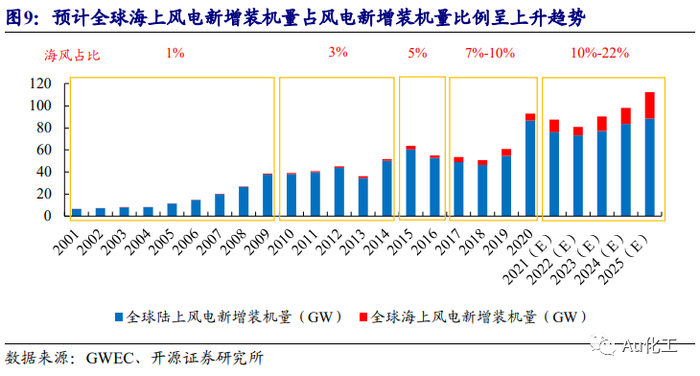 从整体规模来看,国内陆上风电将呈稳定增长、海上风电呈快速增长。截至2021年三季度末,全国风电累计装机297GW,其中陆上风电累计装机284GW、海上风电累计装机13GW。据GWEC统计,2020年国内海上风电新增装机占总新增装机比例为5.88%。据国家能源局数据,2021年1-9月,全国风电新增并网装机16.43GW,其中陆上风电新增装机12.61GW、海上风电新增装机3.82GW,受2021年海上风电抢装拉动,海上风电比例大幅上升至23%。尽管未来补贴退坡,但在“双碳目标”有力推动下,风电作为主要可再生能源之一,有望得到快速发展,一批海上风电项目呼之欲出,多地明确海上风电基地建设计划。据中国能源报预计,“十四五”期间,我国海上风电累计新增规模将达到45GW,即年均实现9GW海上风电新增装机量。海上风电也成为全球风电发展的新趋势,GWEC预计2020-2025年全球陆上/海上风电新增装机量CAGR分别为0.32%/31.41%,预计2025年全球海上风电新增装机量占比将达21.30%。