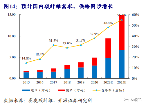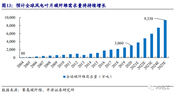 随着风力发电机功率增大,特别是在海上风机的需求刺激下,全球风机大型化的趋势日益明显,对材料轻质、高强、高刚、耐疲劳等特性需求也越来越明确,而碳纤维恰好兼顾这些特性。根据中复神鹰招股说明书,采用碳纤维的120m风轮叶片可以有效减少总体自重38%,成本下降14%。大丝束碳纤维打破了碳纤维高价带来的应用局限,在风电叶片领域具备广阔的发展前景,赛奥碳纤维预计,2025年全球叶片碳纤维需求量将达到9.34万吨,2020-2025年CAGR高达25%。国内企业布局大丝束碳纤维产业链,有望受益于风电叶片大型化趋势。受益标的:上海石化、吉林碳谷、吉林化纤、光威复材。