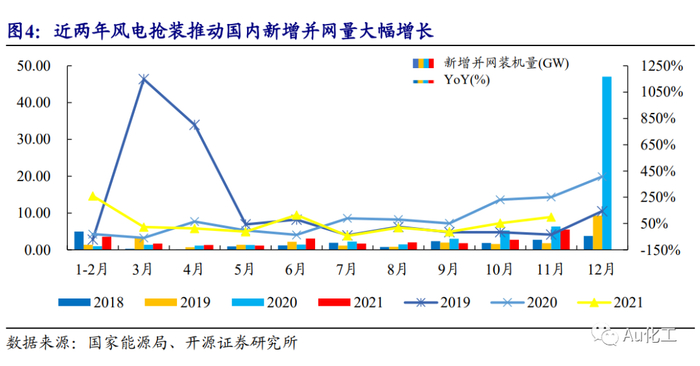 据国际可再生能源机构,2010-2020年全球陆上风电成本从0.089美元/千瓦时下降56%至0.039美元/千瓦时;全球海上风电成本从0.162美元/千瓦时下降48%至0.084美元/千瓦时,风电正逐步成为全球范围内最经济的可再生能源之一。中国风电累计容量及增速领跑全球,截至2020年底,中国风电装机规模占全球比例为38.5%。未来5-10年是中国能源转型和绿色发展的关键期,“十四五”期间可再生能源将成为中国能源消费增量的主体,风电作为主要可再生能源之一,有望快速发展,一批海上风电项目呼之欲出,多地明确海上风电基地建设计划,积极推进大功率机型。我们建议关注风电产业升级降本过程中,叶片材料革新以及海风加速崛起带来的大丝束碳纤维、酸酐固化剂、国产灌浆料的投资机会。