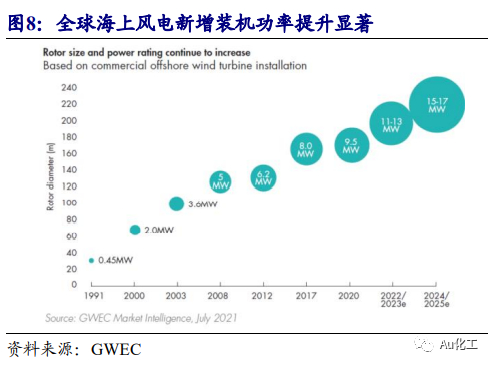 据中国能源报新闻,预计 “十四五”期间,我国海上风电累计新增规模将达到45GW,即年均实现9GW海上风电新增装机量。2021年11月16日,中欧海上风电产业合作与技术创新论坛在盐城召开,国家能源局新能源司副司长王大鹏出席论坛并致辞,提及风电场布局从近海向深水沿岸转变,目前海洋生态环境保护意识逐步增强,近海海上风电总体开发潜力有限,“十四五”中后期近海资源初步紧张。同时,借鉴欧洲海上风电经验趋势,中国海上风电建设海域由近及远发展是必然趋势。海上风电机组大型化同样也是近年来的发展趋势,在风电机组单位千瓦建设成本大致相同的情况下,大功率机组不仅发电量更高,随着机位数的减少,运输、吊装、以及线路等费用的节省同样可观。在“单位千瓦成本一定,追求发电量最高”的导向下,风机单机功率的增大成为不可逆转之势。