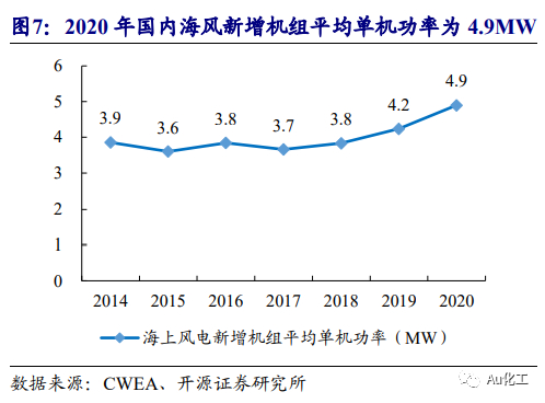 海上风电资源丰富,大功率机型加速推进。海上风电是指在沿海多年平均大潮高潮线以下海域或相关海域内无居民海岛上的风电开发,具有节约土地资源、风能资源丰富、规模集群效应显著、发电状态稳定等优势。当前国内海上机组单机容量主要集中在2.5MW-4MW,近海海上风电总体开发潜力有限,“十四五”中后期近海资源初步紧张,未来风电场布局从近海向深水沿岸转变。在“单位千瓦成本一定,追求发电量最高”的导向下,海上风电机组将趋于大功率,带来高发电量且机位数减少,运输、吊装、线路等费用大大降低。我国整机厂商已积极布局8MW以上产品,上海电气已于2018年从西门子Gamesa可再生能源公司引进SG8MW-167海上风电机组,并计划与浙江大学合作对10MW量级以上机组进行攻关。金风科技也在2018年发布了GW168-8MW机型,并计划在福建三峡兴化湾二期海上风场安装两台8MW样机。此外,中国海装、湘电风能、明阳智能等诸多整机厂商也在开展大容量机组的研发。