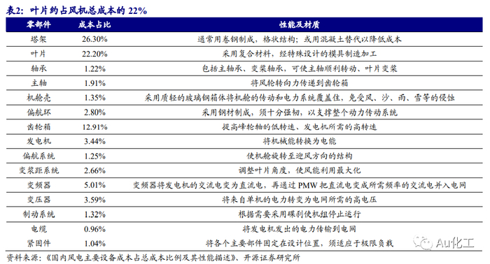我们建议关注风电产业升级过程中,叶片材料革新以及海风加速崛起带来的大丝束碳纤维、酸酐固化剂、国产灌浆料的投资机会。风力发电机主要由叶轮、机舱、塔筒三部分构成。由于风电场招标时塔筒一般单独招标,风力机组通常即指叶轮和机舱两部分。风机的叶轮负责将风能转化为机械能,它由叶片、轮毂、整流罩组成,其中叶片将空气的动能转化为叶片和主轴的机械能,继而通过发电机转化为电能,叶片约占风机总成本的22%。叶片的尺寸、形状直接决定了能量转化效率,也直接决定了机组功率和性能,因此风电叶片在风机设计中处于核心地位。对于目前风电叶片使用的复合材料而言,材料与工艺是两个最为重要的因素。就材料而言,目前主要用于生产风电叶片的复合材料为玻璃纤维复合材料,玻璃纤维增强材料用于提供刚度与强度,基体材料则使用环氧树脂用于提供韧性与耐久性;就工艺而言,目前真空灌注成型工艺作为生产玻璃纤维复合材料的主要成型工艺被广泛运用。随着海上大叶片的发展,碳纤维轻质高模高强增强材料用量剧增,拉挤成型工艺愈发成熟拉动酸酐类新型固化剂的替代需求,越来越重的叶片对海上风机基座灌浆料也提出了更苛刻的要求。