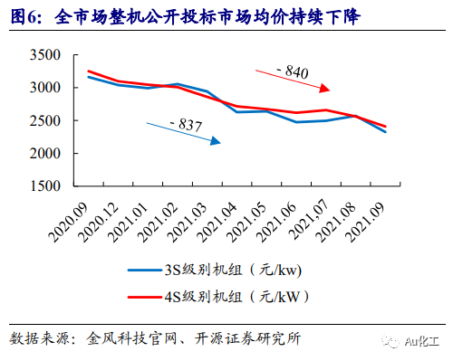 陆上风电平价后持续降本,风电新增招标快速增加。陆上风电的降本渠道:一是供应链降本提质,上游零部件企业专业化和研发实力提升,进口替代加速,零部件价格下降。下游开发模式转变,招标模式向集中式、框架式采购转变,促进风机制造企业集中排产、协调供应链。二是风机大型化降本,风机单机大型化趋势明朗,国内新增陆上风机装机单机功率从2MW向3MW-6MW转变,单位物料用量下降。三是机型设计升级完善,风机结构精简降本。在中东部地区,平价风电、分散式风电项目日益增多。2021年1-9月全国公开市场风电招标量达41.8GW,已超过2020年全年总量;截至2021年第三季度末,国内已招标未并网累计54.34GW,预计将在2021年四季度至2022年陆续交付。