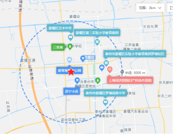 周边生活氛围浓厚,教育、商业、医疗配套完善,地块3km范围内聚集了泰州市姜堰区实验小学教育集团罗塘校区、泰州市姜堰区罗塘高级中学、三级医院(非三甲)上海同济医院妇产科协作医院、购物中心万达广场(泰州姜堰店)等生活配套;有姜堰体育公园、南石公园等4个公园景点。