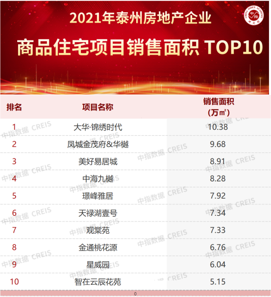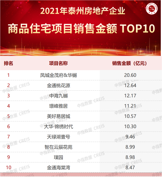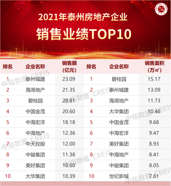 特别声明:房地产企业销售数据统计是以2021年1月1日-12月31日期间销售的商品房为统计口径,主要依据中指数据CREIS(点击试用)在泰州市的销售监测数据,并参考企业提供的相关数据,经课题组严格审核纳入统计。本报告仅供参考,课题组不对使用报告及其内容所引发的任何直接或间接损失承担责任。