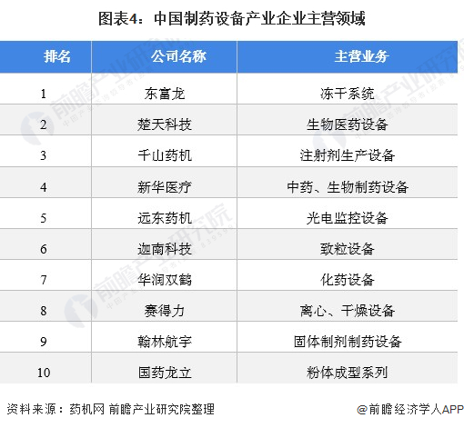 中游代表性企业主要有东富龙、楚天科技、新华医疗、迦南科技、千山药机和新华等众多制药设备厂商;