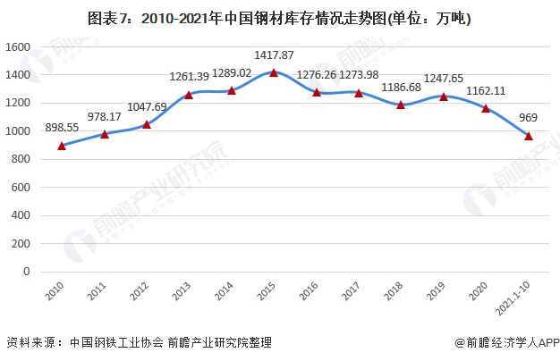 截至2021年10月底,中国钢材库存969万吨,环比减少47万吨,下降4.7%,库存连续下降。