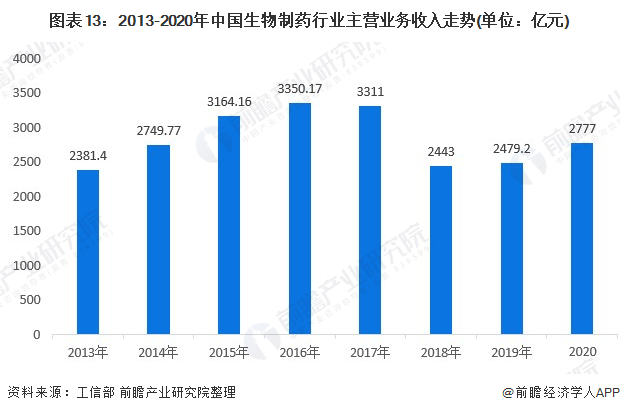 在国家政策的引导和推动下,2013年后我国生物药品制造行业进入快速发展阶段,近年来增速有所放缓,行业进入平稳发展阶段。从行业主营业务收入走势来看,2013-2016年我国生物制药行业主营业务收入逐年上升,2018年出现较大下滑之后重拾上涨态势,2020年生物制药行业主营业务收入约为2777亿元。