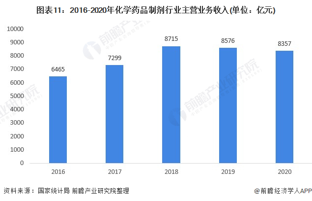 根据南方医药经济研究所对化学药品制剂工业生产总值的研究,2010-2019年化学药品制剂工业生产总值呈逐年增长态势,2019年化学药品制剂行业主营业务收入总计为8576亿元,同比增长11.5%。2020年化学药品制剂行业实现主营业务收入8357亿元。
