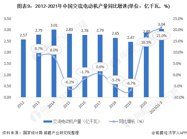 根据国家统计局数据,2014-2018年,中国交流电动机产量总体呈现下滑趋势。2020年,交流电动机累计产量为2.88亿千瓦,同比增长16.5%。2021年前三季度,交流电动机累计产量为3.04亿千瓦,同比增长21.0%。