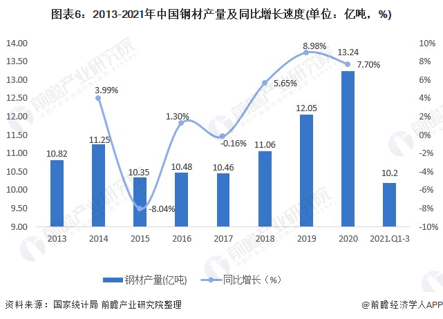 2013-2020年,我国钢材产量呈波动增长趋势。根据国家统计局最新统计数据显示,2019年,我国钢材产量为12.05亿吨,同比上涨8.98%。2020年,我国钢材产量为13.24亿吨,同比上涨7.7%。