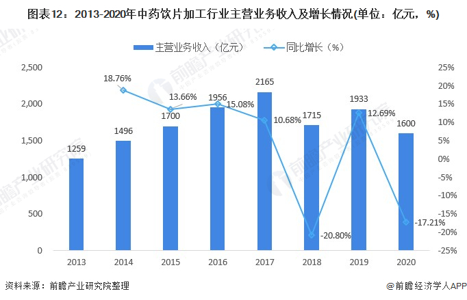 国家高度重视中医药事业发展,出台了一系列利好政策,群众对中医药的需求也越来越高。2013-2017年,我国中药饮片销售情况持续走高,但增长幅度整体呈现下降趋势。近两年,受质量标准逐渐提高以及行业监管趋严,如加强GMP认证和飞检等影响,行业增速趋缓,2018年销售收入同比减少14.26%,达1580.53亿元。2019年行业收入将有所回升,达1932.50亿元,较去年增长12.69%。2020年上半年,行业实现主营业务收入为802.10亿元。据前瞻产业研究院初步统计2020年中国中药饮片加工行业主营业务收入约为1600亿元左右。