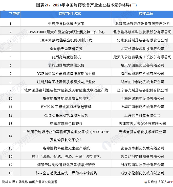 在制药设备技术方面,2021年10月21日,中国制药设备行业协会发布2021年中国制药设备行业技术创新奖名单中。江浙沪地区技术发展领先,五家一等奖技术获奖单位中国有三家来自江浙沪,二等奖中有5家,三等奖7家。