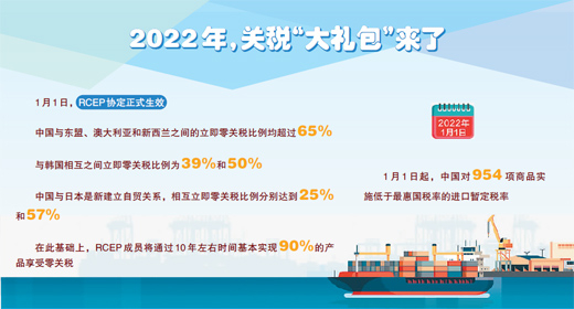 随着2022年零点钟声响起,RCEP协定正式生效。零关税,是协议生效后的一个重要变化。中国与东盟、澳大利亚和新西兰之间的立即零关税比例均超过65%,与韩国相互之间立即零关税比例为39%和50%,中国与日本是新建立自贸关系,相互立即零关税比例分别达到25%和57%。在此基础上,RCEP成员将通过10年左右时间基本实现90%的产品享受零关税。