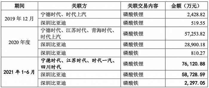 如此一来,湖南裕能也实现了用股权换订单。天府财经网注意到,2020年全年,湖南裕能向关联方出售磷酸铁锂、磷酸铁的销售额为8.7亿元,但到了2021年上半年,对关联方的销售额增至13.71亿元,接近2020年全年的2倍,订单增长主要由宁德时代、比亚迪、江苏时代等贡献。
