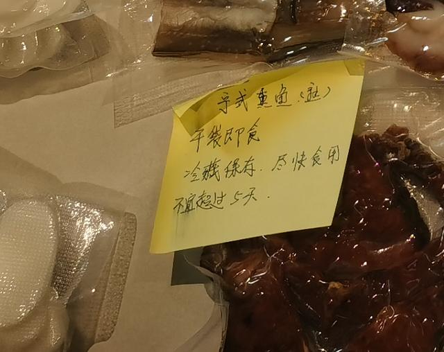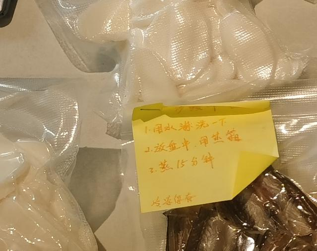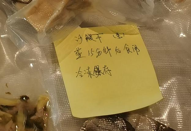 每种食物上都贴着便利贴,上面是妈妈的笔迹,有食物的保存时间、方式以及烹饪方式,非常详细。