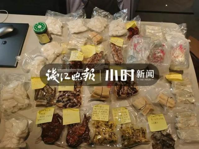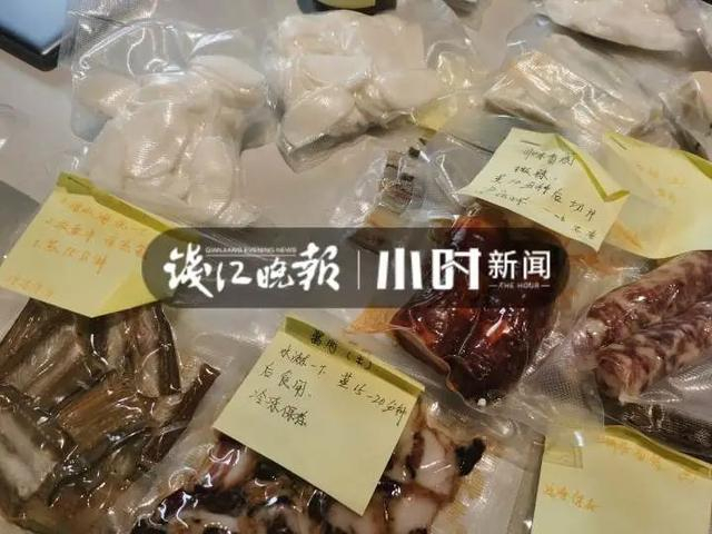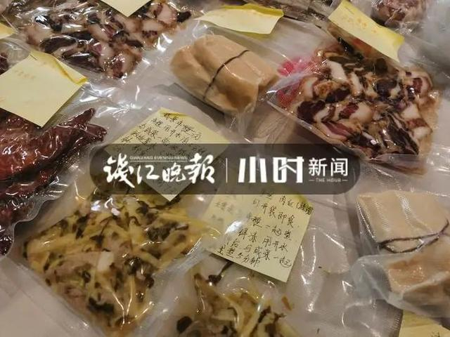 里面是大大小小20多包东西,全是他爱吃的菜。酱肉、香肠、熏鱼、千张包、沙鳗干、年糕等,一袋袋真空包装好。