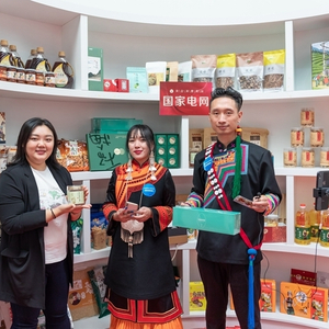 在“央企消费帮扶 助力乡村振兴”农特产品品鉴会暨央企消费帮扶平台电商直播节期间,工作人员在介绍国家电网公司帮扶地区特色农产品。