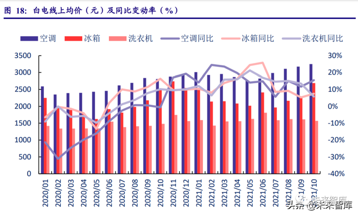 分季度来看,厨房小家电一季度由于去年 1-2 月基数较低影响同比变动较小,二季度则由 于高基数原因急速下降,三季度高基数影响逐步消弱,同比增速下滑趋势有所好转。受疫情影响原材料价格提升,产品制造成本增加,但小家电整体价格不管从线上还是线下 涨幅来看都相对保守,部分产品种类价格持续下降,像豆浆机、破壁机品类线上均价跌幅超 10%。(报告来源:未来智库)