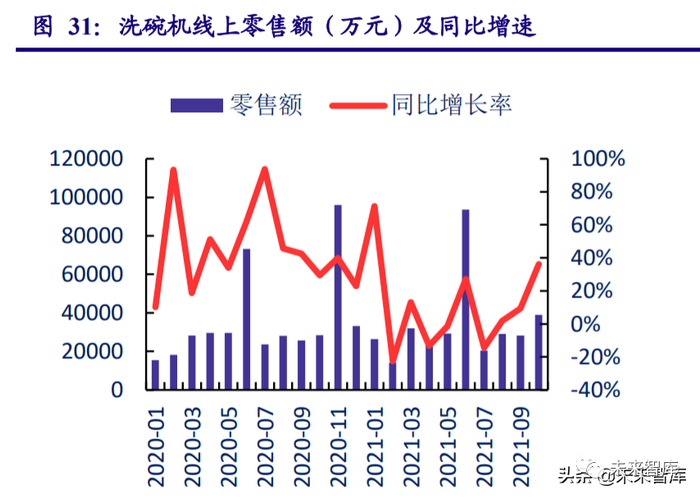 集成灶延续高增速。以油烟机和燃气灶为代表的大厨电表现相对较为低迷,但集成灶表现 较好,延续高增长。2021 年 1-9 月份,集成灶累计出货量为 184.05 万台,同比增长了 33.75%, 延续了去年的高增长。从零售端数据来看,1-10 月份集成灶线上、线下零售额同比增长了 31.2%和 60.6%。其中 线上增速有所波动,线下维持高增速。
