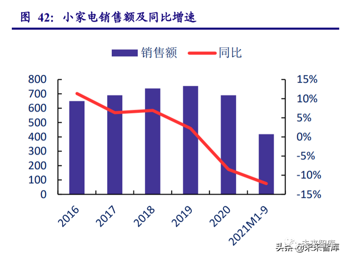 作 为厨房小家电销售的主要渠道,由于龙头布局已比较充分,市场格局也趋于稳定,家电企业将 通过产品结构升级的方式来提高产品销售均价,从而带动规模提升。2021 年线下市场恢复趋 势较为疲弱,在去年低基数的情况下还在继续下滑,但后续随着疫情影响的常态化,线下消费 继续下滑趋势有望得到改善并趋于稳定。虽然未来销售线下占比提升较难,但线下以产品体验 店的形式存在,整体均价会有所提升,所以销额规模将会维持稳中有升。