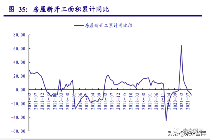 地产开工面积增速下降。新开工面积增速经历了 7 月转负的拐点,呈现“尖锥”形状,在销 售和拿地“双弱”的预期之下,2021 年 1-10 月,新开工面积下降 7.7%,10 月单月增速更是下降 33%,创下历史最低增速,开工情况低于历史任何一个时期。竣工周期的到来在今年得到了验证。2016 年至 2019 年,新开工年均复合增速高达 10.8%, 按照新开工到竣工一般周期在 2-3 年的规律计算,2019-2022 年将迎来竣工高峰,但实际 2019、 2020 年的竣工增速为 2.6%、-4.9%,远低于预期。2021 年 1-10 月竣工面积增长 16.3%,5 月 以来的竣工增速分别为 10.1%、66.6%、25.7%、28.4%、1.0%、-20.6%,2022 年竣工修复具备 确定性和持续性,但强度可能弱于 2021 年。