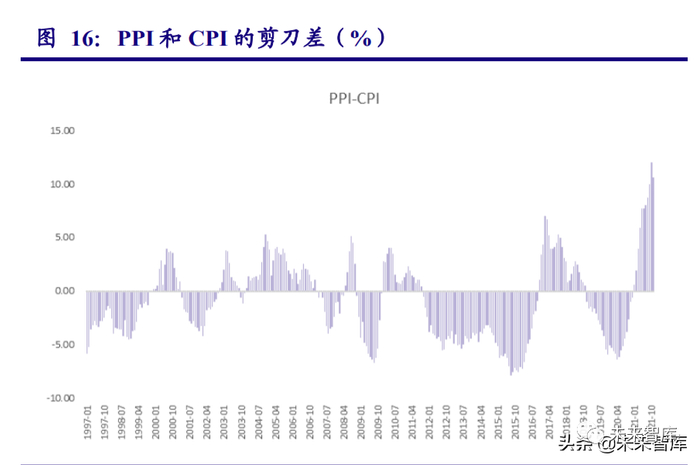 2021 年 4 季度工业端和民用端的价格差值达到了极值,剪刀差的高涨会带来很多后果。民用端低迷的需求只能部分吸收工业端的成本,PPI 对 CPI 的传导在极值情况下会产生,使得 CPI 走高,但是走高的幅度可能不大。生产端的成本不能顺利传导,挤压了中下游的公司,会 带来其中下游行业利润的降低,从而带来生产走低,需求下滑。需求方面现阶段我国处于弱势, 我国生产的走低使得对于大宗商品的需求下滑。