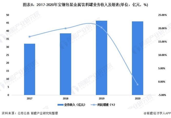 2017年以来,宝钢包装金属饮料罐业务保持着平稳增长的趋势。2020年,由于新冠疫情给公司经营的外部环境带来不利影响,加上上游原材料价格波动较大,叠加汇率双向波动幅度加大等因素,对宝钢包装经营业绩情况产生一定影响,金属饮料罐业务收入小幅下降1%至46.01亿元。