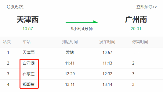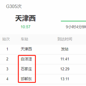 G305次列车从天津西站出发后,途经河北的白洋淀站、石家庄站、邯郸东站。