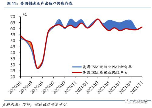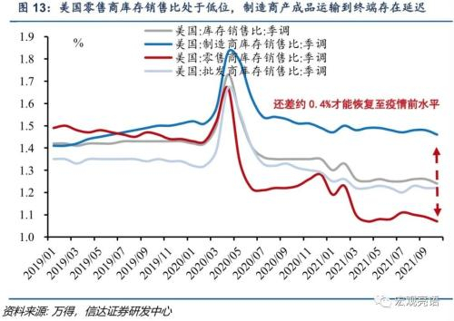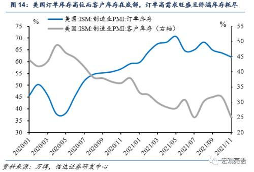 美国的通胀从上游传导至下游的流程来看:首先是成本的上涨;企业是否有能力去承受上游涨价和高工资成本;然后是能否快速转化成消费利润而回流企业。美国整体消费需求较为强劲,但是由于交通运输问题,导致厂商不仅在生产端,也在产出到零售环节存在问题(图11中制造业PMI新订单和产出存在缺口,图13美国零售商库存销售比率处于低位,制造商产成品运输到零售端有延迟,零售端库存长期不足,跟不上消费需求)。制造商订单库存代表着产成品,客户库存代表着零售终端的库存,图14的形态也反映出了相同的问题。