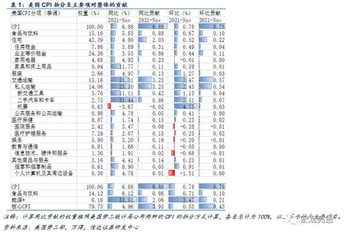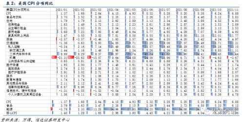 此次美国高通胀与疫情和量化宽松皆有极大关系(见图10),具体拆项来看,CPI同比高涨,是由运输成本飙升(拉动通胀水平47%)和住宅租金高涨(拉动通胀水平29.5%)共同导致。我们用另一种方式测算得到,能源价格(拉动通胀水平29.9%)也推升了通胀。如表1,我们用两种方式对CPI进行拆分,美国11月CPI录得6.88%,其中住宅租金、私人运输(美国CPI统计中私人运输项下包括二手车和卡车)和能源项拉动最大,分别对CPI同比贡献了约2.03、3.25和2.06个百分点。食品和饮料也贡献了CPI约0.88个百分点。分项来看,能源、二手汽车和卡车、以及家具和床上用品同比增长幅度较大,11月同比分别录得33.51%、31.44%和11.77%。