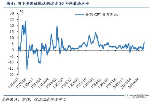 我们认为美国2022年高通胀压力大概率仍然会持续,下半年有望回落至正常水平,年末通胀水平可能会略高于2%。CPI大概会在2022年底回归至2.4%左右,核心PCE大概会在2022年底回归至2.3%。随着通胀愈演愈烈,首次加息可能会提前至3月16日的FOMC会议,全年加息三次或以上,缩表节奏和体量相比上一轮更为激进,具体根据数据决定(data dependent)。美国2022.1.5日的FOMC纪要解释道[1]:A significant amount of balance sheet shrinkage, and almost all participants agreed that it would likely be aPPropriate to initiate balance sheet runoff at some point after the first increase in the target range for the federal funds rate. 此前美国迟迟不收紧的原因,是由2020年8月公布的新的货币政策框架:将就业放在第一位,稳定通胀放在第二位(详见《如果美联储政策调整,中国央行怎么应对》)导致。美国上半年劳动力市场修复缓慢,导致美联储面临高通胀,仍旧按兵不动。当下,美国CPI达到了近30年来最高点(见图4),录得6.88%,失业率已经落入自然失业率4.64%以下,美联储紧急退出债券购买并计划加息缩表。