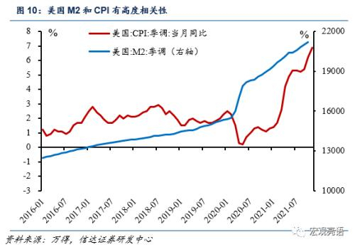 美国本次高通胀是由生产端供应链问题(Shipment)和劳动力短缺,以及需求端商品消费需求(尤其是耐用品)暴涨共同导致。疫情改变了人们的消费结构,服务消费减少但是商品需求增加,经济环境尤其是供应链无法匹配消费者如此大程度对实物商品的需求,导致PCE耐用品价格暴涨,当下核心PCE录得4.68%,CPI录得6.8%,运输成本飙升(拉动 3.23%),住宅租金高涨(拉动2.03%)和能源价格(拉动2.06%)都推升了通胀。由于导致通胀的种种原因都无法短期修复,美联储不得不加速收紧货币政策,控制通胀水平。我们预测CPI在2022年底回归至2.3-2.4%,核心PCE回归至2.3%。